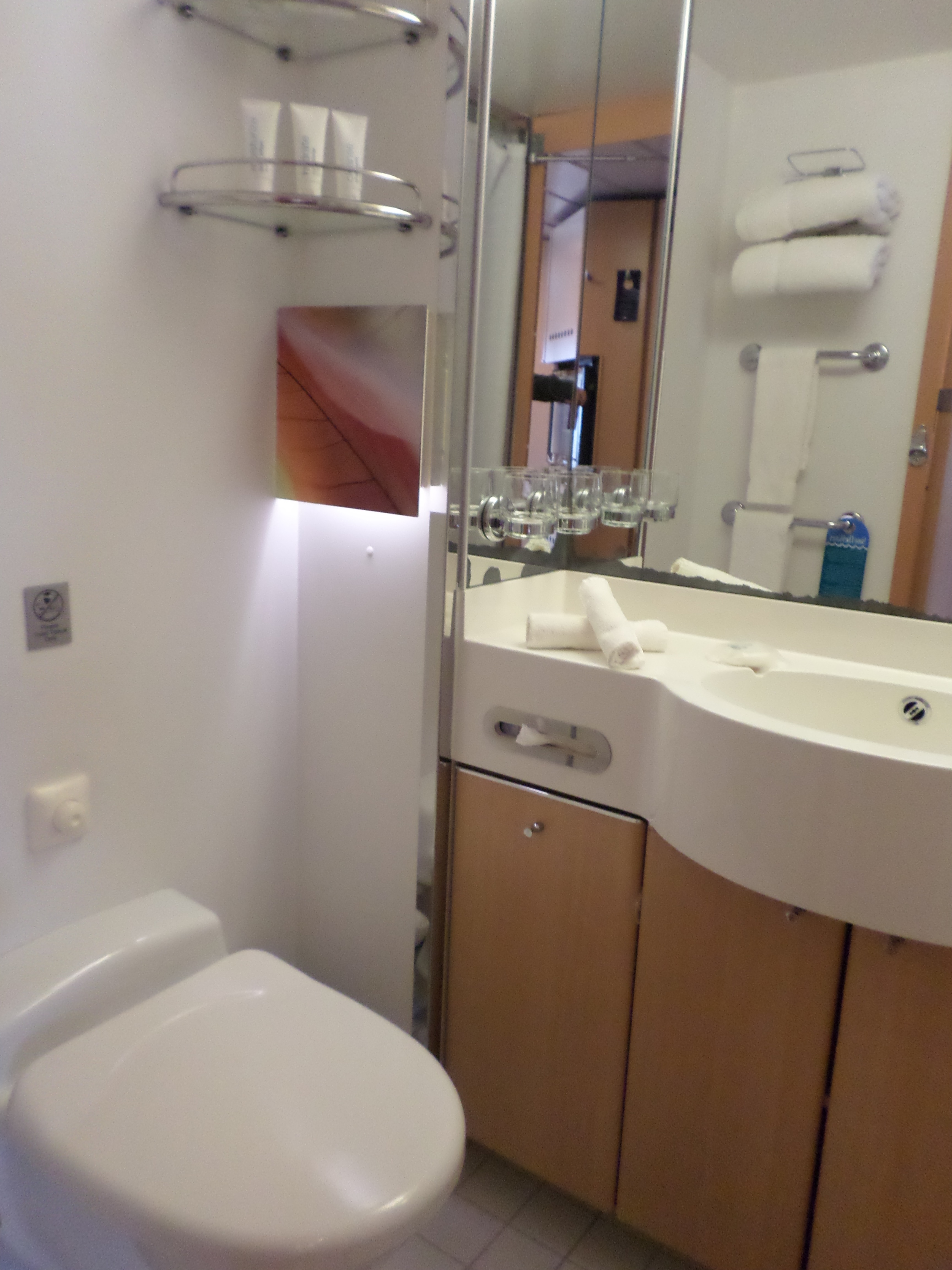 Once I got over that little shock, the bathroom served its purpose for a single room occupant. The ship has a water conservation program, so you could hang your towel up if you wanted to re-use your towel more than once. If you chose not to re-use your towel, then you would just place it on the floor. I was kind of freaked out about throwing stuff on the floor because I run around like a drill sergeant on my own family about that behavior, so it was weird.