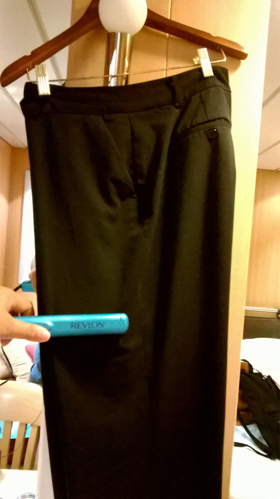 To the horror of my fellow co-workers and myself, we learned the week before that irons were not allowed on cruise ships. The ship did provide a fee-for-service option that would press your garments for you. I am not a woman of means, but a woman of resource; thus, I discovered a temporary fix for this small problem.